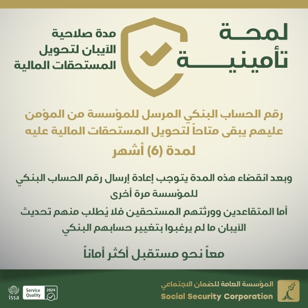 *مؤسسة الضمان الاجتماعي تدعو جمهورها من غير المتقاعدين إلى تحديث أرقام حساباتهم البنكية التي مضى عليها أكثر من (6) أشهر