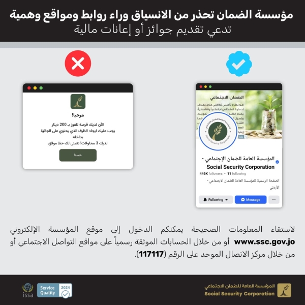 *مؤسسة الضمان الاجتماعي تحذر من الانسياق وراء روابط ومواقع وهمية تدعي تقديم جوائز أو إعانات مالية باسمها
