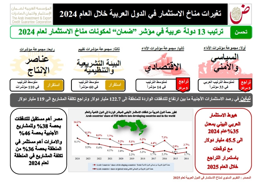 "ضمان" توصي بتنفيذ حزمة إجراءات لتحسين مناخ الاستثمار بالدول العربية