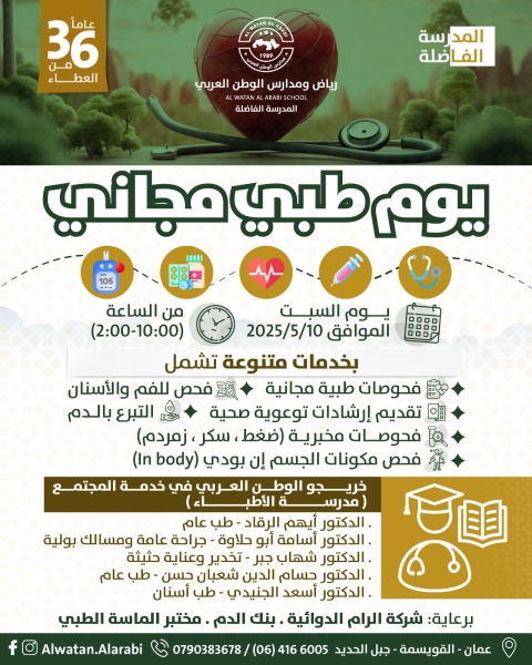 يوم طبي مجاني في رياض ومدارس الوطن العربي السبت