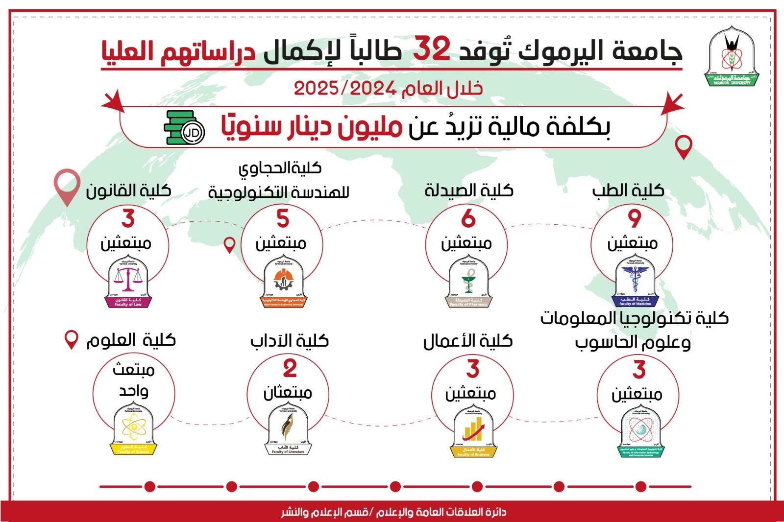 "اليرموك" توفد 32 طالبا لإكمال دراساتهم العليا خلال العام الجامعي الحالي