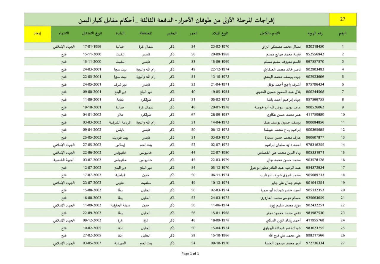 أسماء الأسرى المحررين غداً ضمن الدفعة الثانية من صفقة التبادل في المرحلة الأولى والتي تضم 110 أسرى