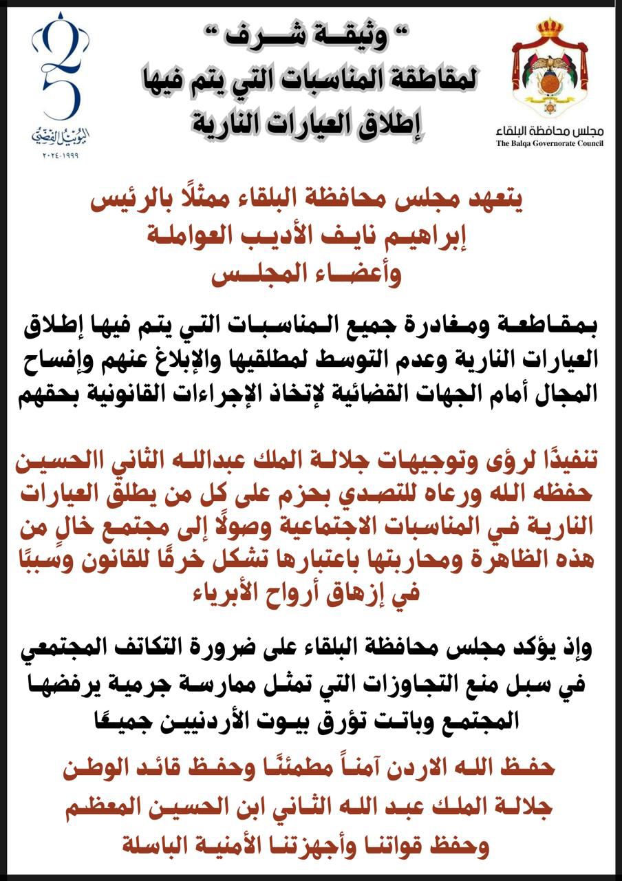 وثيقة في البلقاء لمقاطعة المناسبات التي تُطلق فيها العيارات النارية
