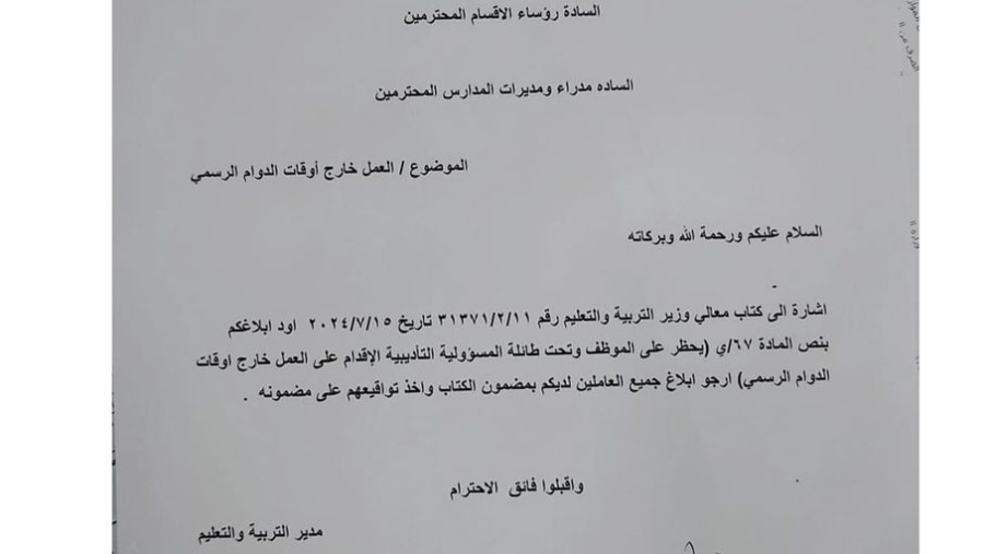 التربية" تعمم على المعلمين بعدم العمل خارج اوقات الدوام