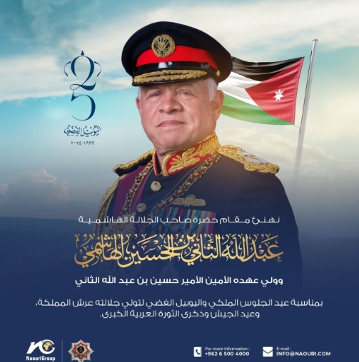 مجموعة الناعوري تهنئ جلالة الملك بعيد الجلوس الملكي وعيد الجيش وذكرى الثورة العربية الكبرى