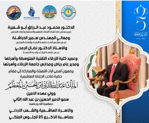 أسرة جامعة الزرقاء تهنئ جلالة الملك وولي العهد بمناسبة الذكرى 25 للجلوس الملكي