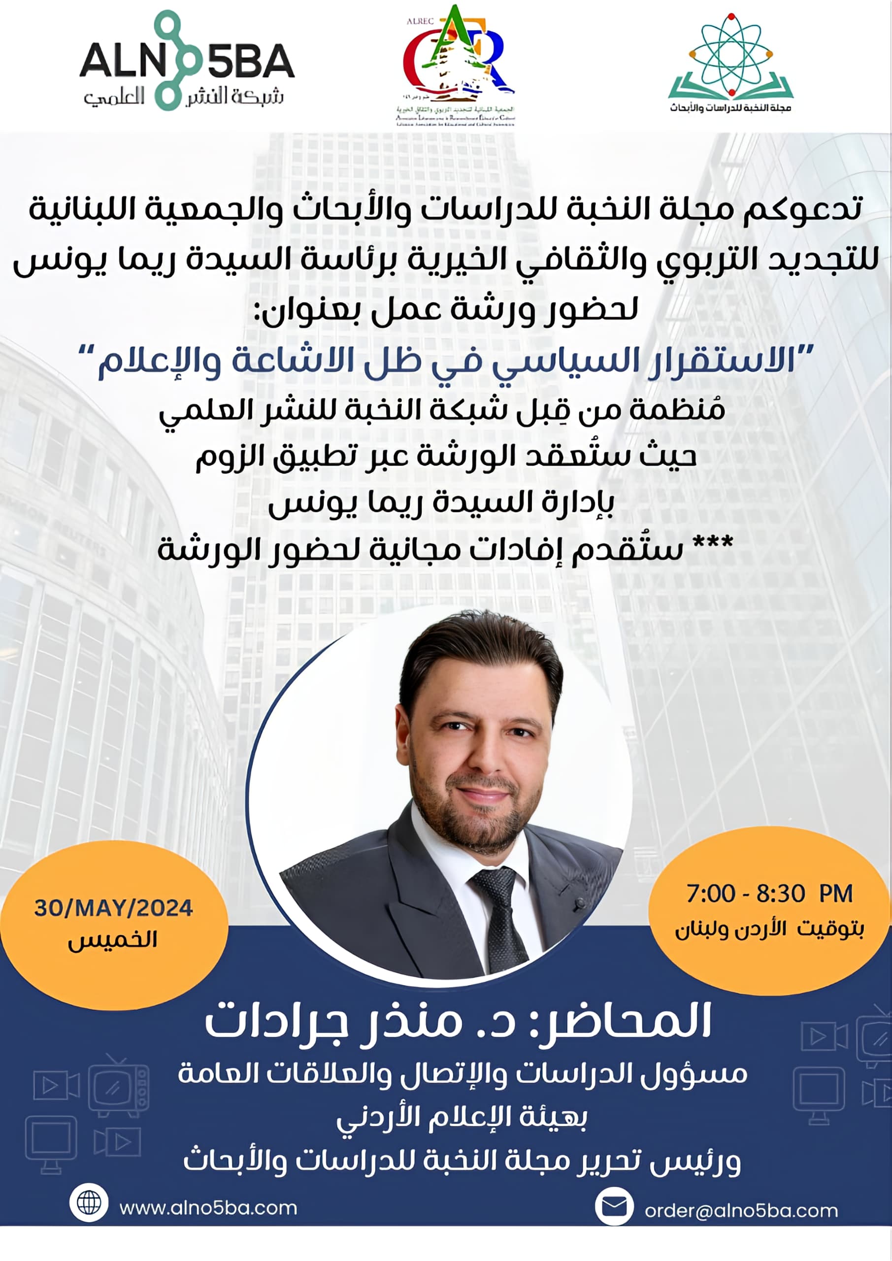 ورشة عمل عن "الاستقرار السياسي في ظل الإشاعة والإعلام" تنظمها شبكة النخبة للنشر العلمي والجمعية اللبنانية للتجديد التربوي والثقافي