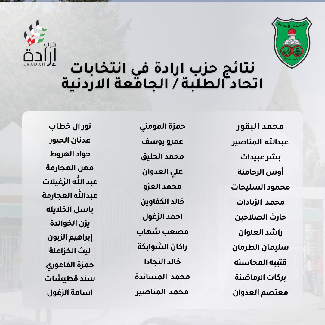 حزب إرادة يهنيء الطلبة ال ٣٧ الفائزين معه في إنتخابات طلبة الجامعة الأردنية