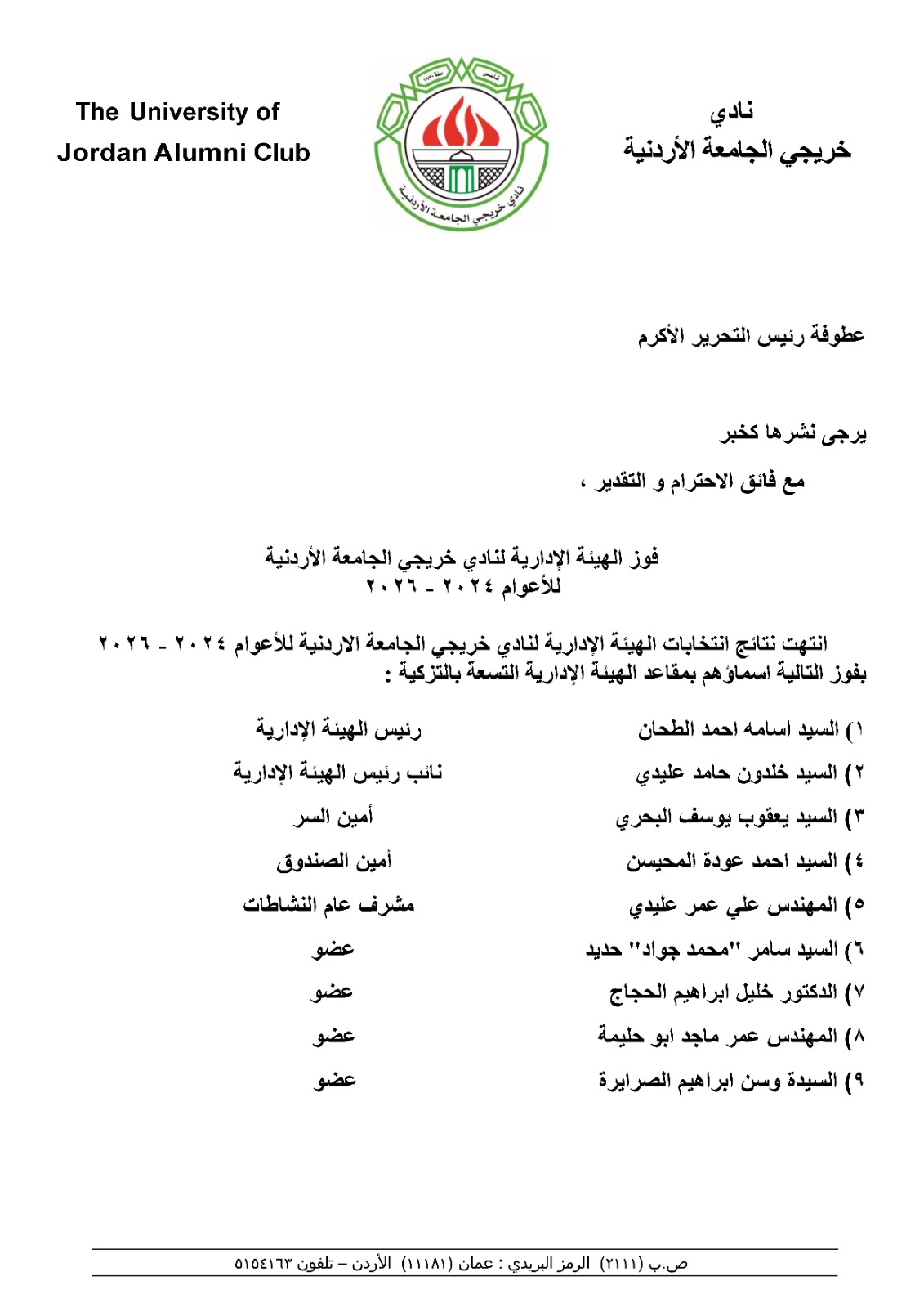 إعلان نتائج انتخابات الهيئه الاداريه لنادي خربجي الجامعه الأردنية الأعوام2024-2026