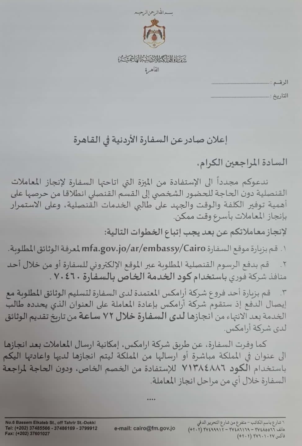 إعلان صادر عن السفارة الأردنية في القاهرة