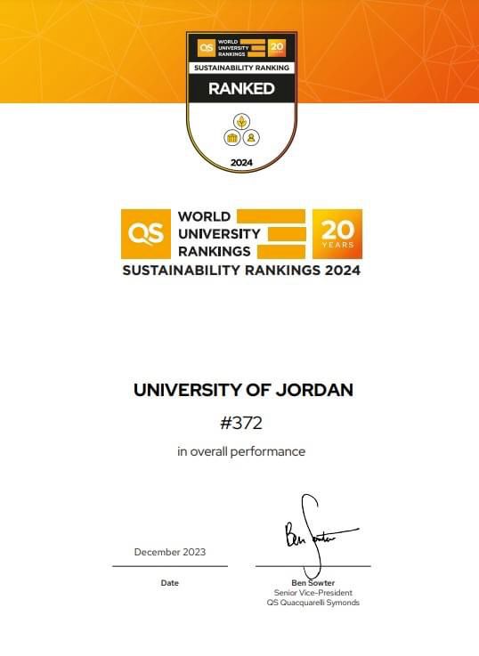 الأردنية في المرتبة 372 عالميا والثامن عربيا والأولى محليا في تصنيف الاستدامة كيو أس 2024