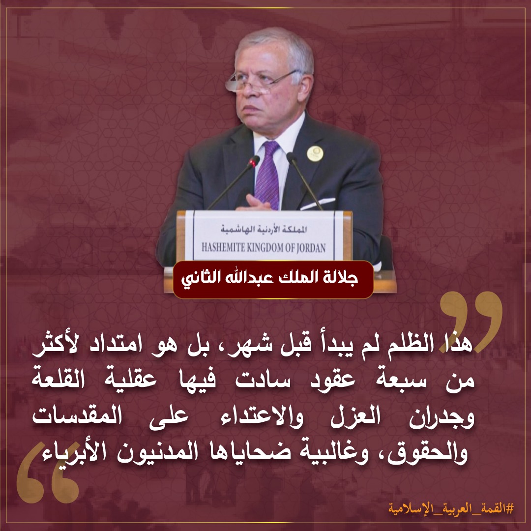 الملك في القمة العربيه الإسلاميه المشتركه الغير عاديه حول غزه قيم الإسلام والمسيحه واليهوديه لا تقبل قتل المدنيين او الوحشيه