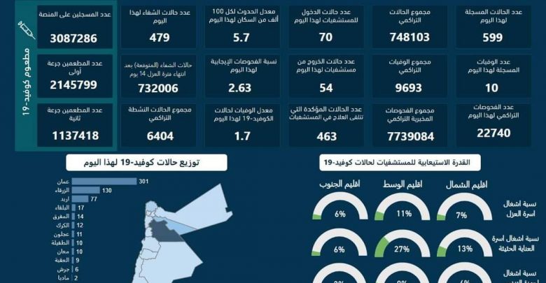 تسجيل 599 اصابة جديدة بكورونا و10 وفيات