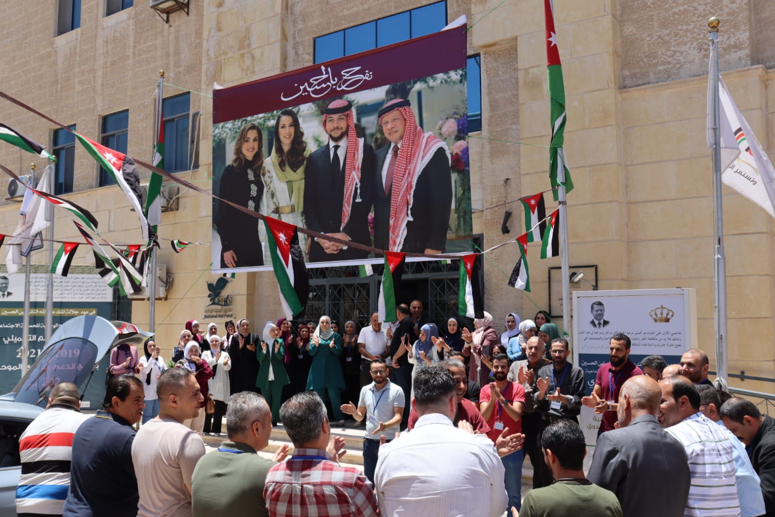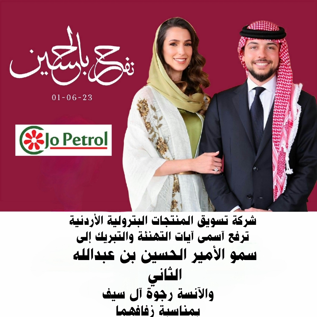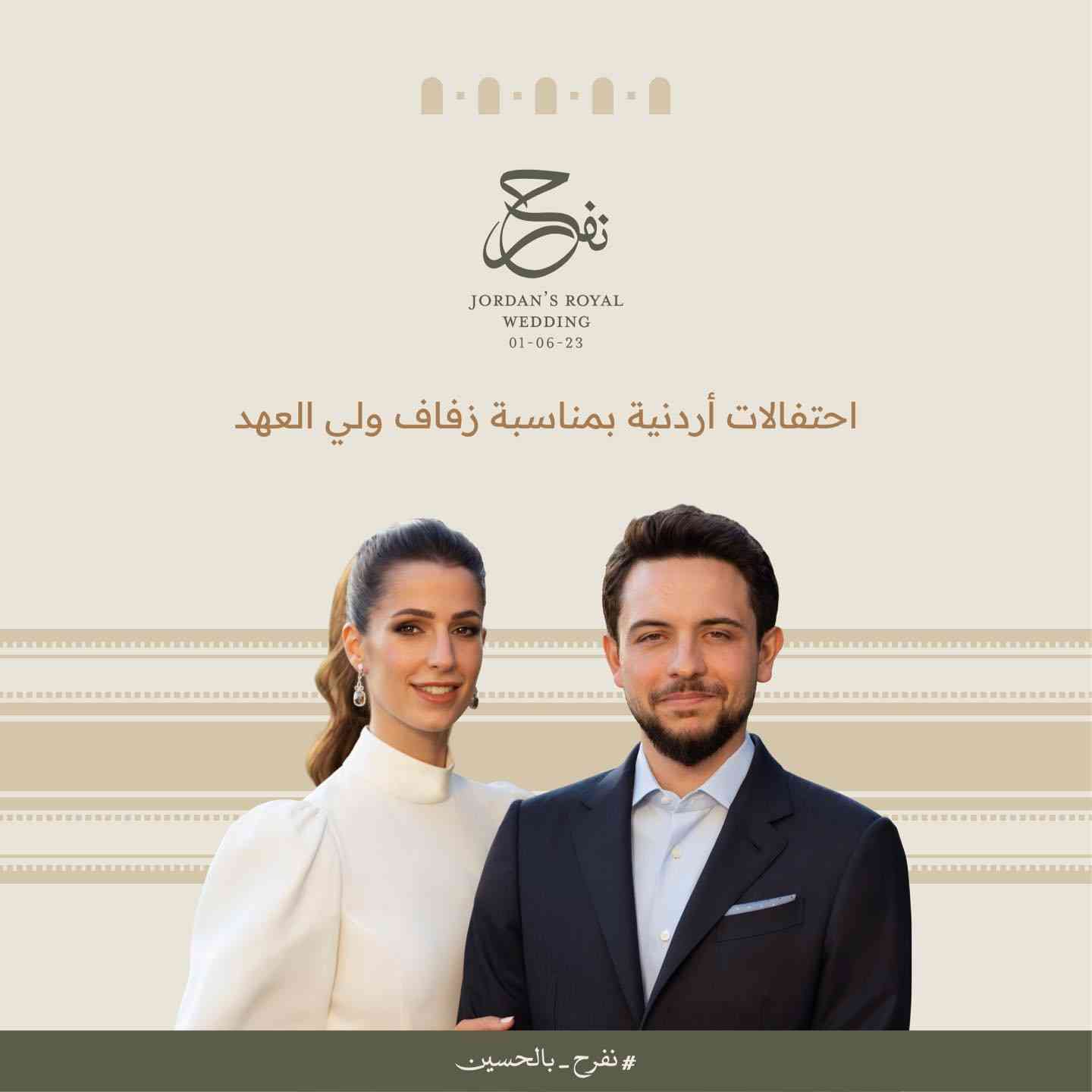 المؤسسة الأردنية لتطوير المشاريع الاقتصادية والشركات التابعة والشركاء من القطاع الخاص يزينون عدة مناطق بصور سمو الأمير الحسين ولي العهد وعروسته احتفالاً بزفافه الميمون.