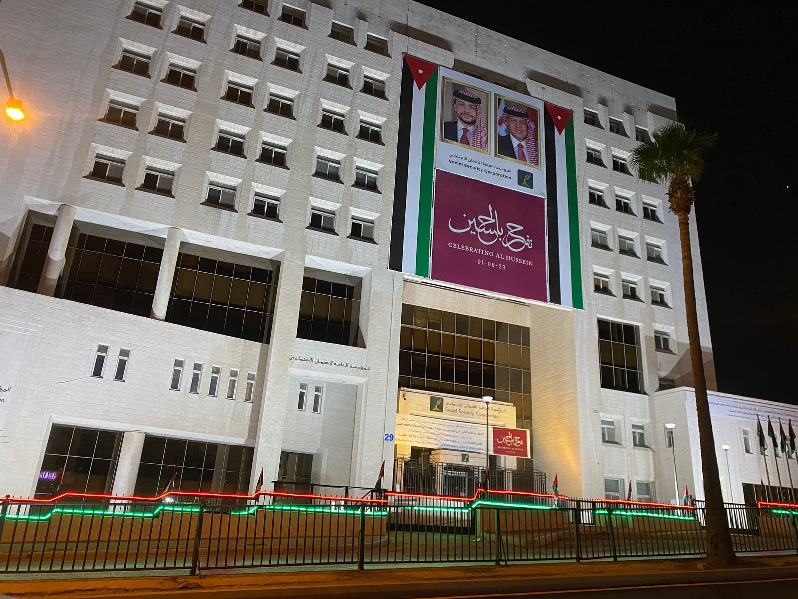 "الضمان الاجتماعي يتزين بعلم الأردن وشعار نفرح بالحسين وصور جلالة الملك وسمو ولي العهد"