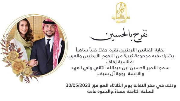 "الفنانين الأردنيين" تعلن عن اقامة حفل فني بمناسبة زفاف ولي العهد.