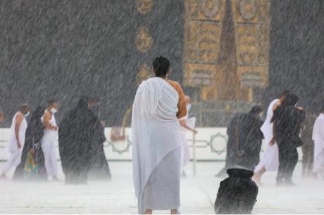 مشاهد تخطف القلوب.. معتمرون تحت المطر بالمسجد الحرام