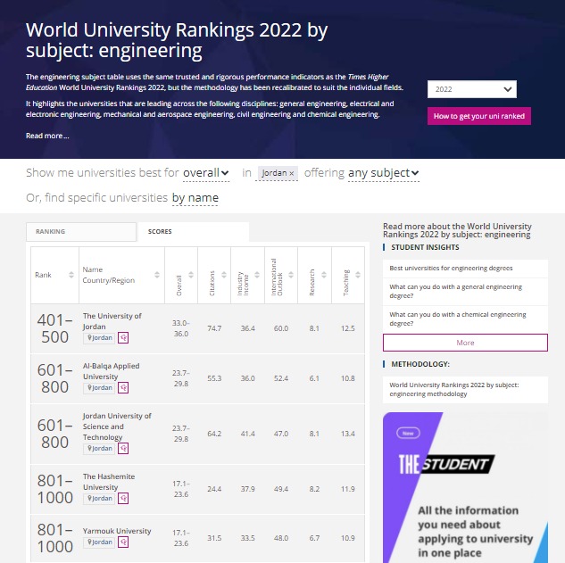 البلقاء التطبيقية ضمن الفئة (601-800) عالمياً في تصنيف التايمز لحقل الهندسة للعام 2022، وفي المرتبة الثانية محليا